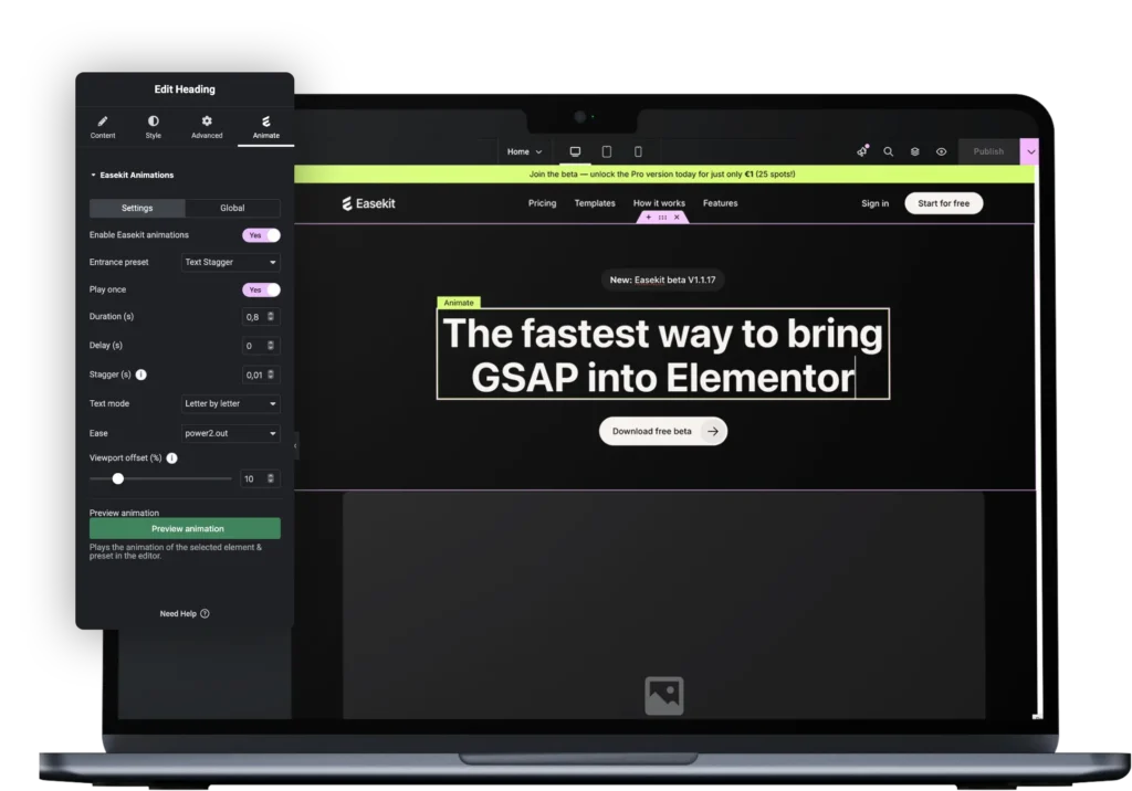 EaseKit lets you add scroll, hover, or load-based animations to Elementor widgets, all with an intuitive visual editor. Under the hood? Real GSAP code. That means pixel-perfect motion, smooth playback, and zero performance trade-offs.